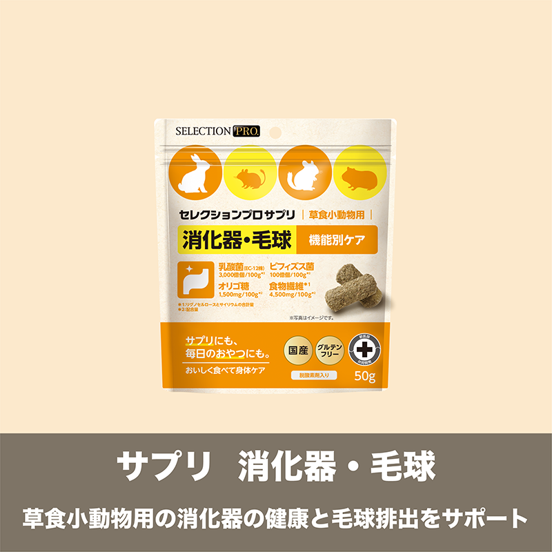 チモシーミール、アルファルファミール、えん麦、脱脂大豆、タピオカ澱粉、乾燥おから、ビール酵母、リグノセルロース(樹木由来)、セルロース(樹木由来)、サイリウム、たんぽぽ粉末、おおばこ粉末、植物抽出発酵エキス、オリゴ糖、乾燥キャベツ、乾燥小松菜、、乾燥ブロッコリー、乾燥カモミール、殺菌処理乳酸菌、乾燥にんじん、乾燥かぼちゃ、L-カルニチン、コエンザイムQ10、GABA(γ-アミノ酪酸)、殺菌処理ビフィズス菌、枇杷の葉粉末、桑の葉粉末、柿の葉粉末、イチョウの葉粉末、ミネラル類(第二リン酸カルシウム、食塩、炭酸カルシウム、硫酸亜鉛、硫酸銅、ヨウ素酸カルシウム)、甘味料(ステビア)、アミノ酸類(DL-メチオニン)、ビタミン類(コリン、C、E、ナイアシン、パントテン酸、イノシトール、B2、B1、B6、葉酸、A、K、B12、ビオチン、D3)