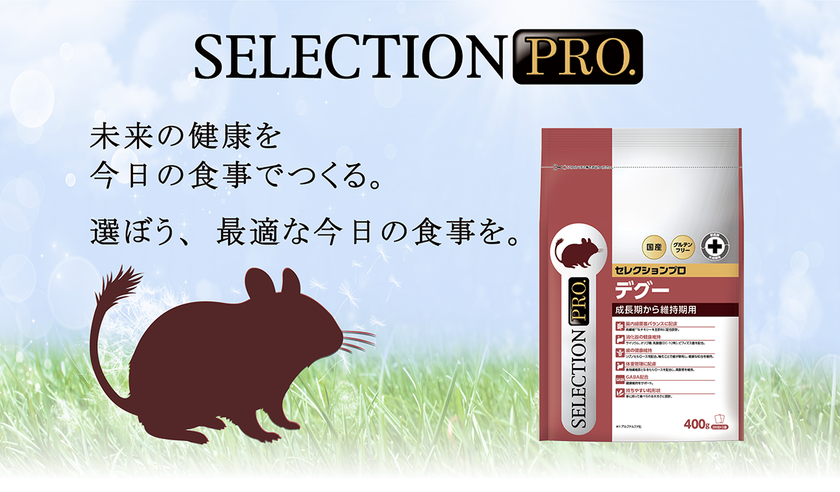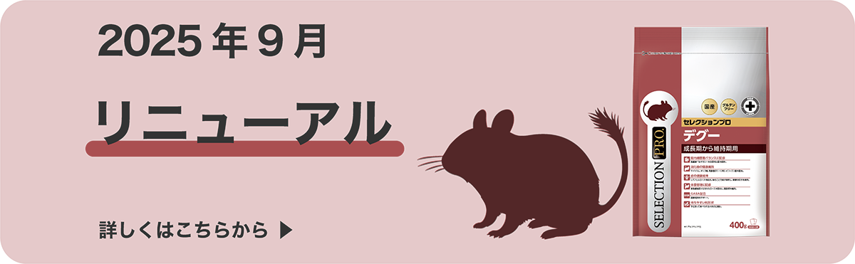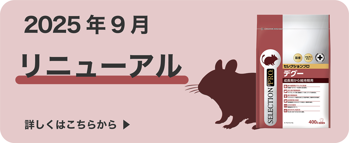 - 食事量は、デグーの年齢・体重・運動量・季節などにより異なります。上の基本量を目安に、デグーの状態に応じて加減してください。