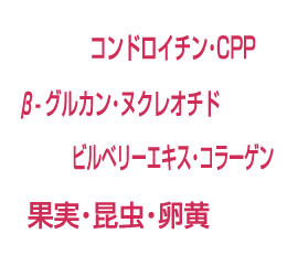 ホミニーフィード、脱脂大豆、コーングルテンミール、昆虫粉末、チキンミール、ビートパルプ、ブドウ糖、ビール酵母、チーズパウダー、アップルパウダー、乾燥バナナ、乾燥じゃこ、卵殻粉末、卵黄粉末、アルファルファミール、ニンジンパウダー、オリゴ糖、植物抽出発酵エキス、乾燥カモミール、乾燥ローズマリー、アガリクス(β-グルカン源)、酵母抽出物(ヌクレオチド源)、コラーゲン、たんぽぽ粉末、おおばこ粉末、CPP(カゼイン・ホスホ・ペプチド)、桑の葉粉末、殺菌処理乳酸菌、コンドロイチン、ビルベリーエキス、ミネラル類(Ca、Cl、Na、K、Zn、P、Mn、Cu、I、Co)、アミノ酸類(Met、タウリン)、ビタミン類(コリン、C、E、ナイアシン、B