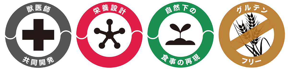 チモシーミール、アルファルファミール、脱脂大豆、えん麦、乾燥おから、ビール酵母、タピオカ澱粉粕、リグノセルロース(樹木由来)、たんぽぽ粉末、おおばこ粉末、植物抽出発酵エキス、アガリクス(β-グルカン源)、乾燥小松菜、、乾燥キャベツ、オリゴ糖、乾燥ブロッコリー、乾燥にんじん、乾燥カモミール、乾燥ローズマリー、殺菌処理乳酸菌、クランベリーパウダー(プロアントシアニジン源)、乾燥かぼちゃ、パン酵母(セレン源)、GABA(γ-アミノ酪酸)、枇杷の葉粉末、桑の葉粉末、柿の葉粉末、イチョウの葉粉末、殺菌処理ビフィズス菌、ミネラル類(食塩、第二リン酸カルシウム、炭酸カルシウム、硫酸亜鉛、硫酸銅、ヨウ素酸カルシウム)、甘味料(ステビア)、ビタミン類(コリン、C、ナイアシン、E、パントテン酸、イノシトール、B2、B1、B6、A、葉酸、K、B12、ビオチン、D3)、アミノ酸類(DL-メチオニン)