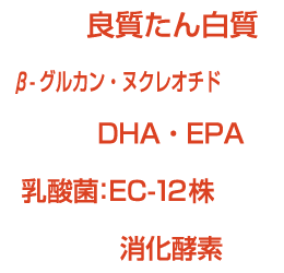 β-グルカンと初乳の主成分であるヌクレオチドを配合し、離乳期・食欲不振時・高齢期等の健康維持に配慮しています。