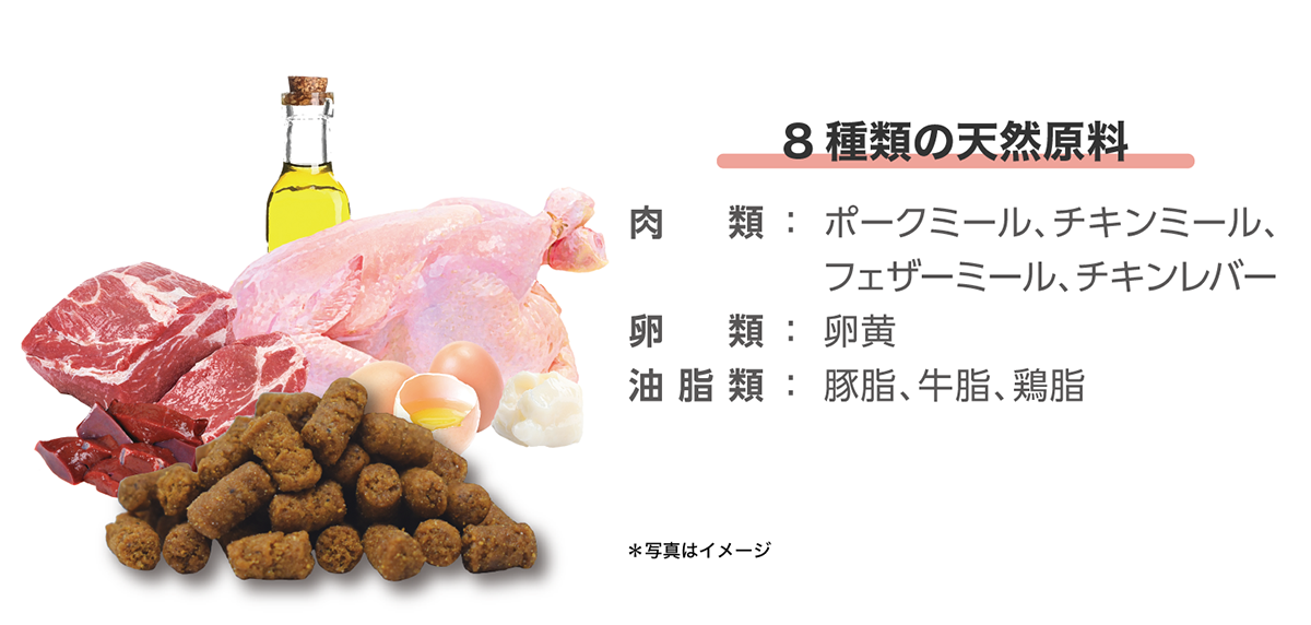 完全な肉食性であることを考慮し、8種の動物性原料を配合。
