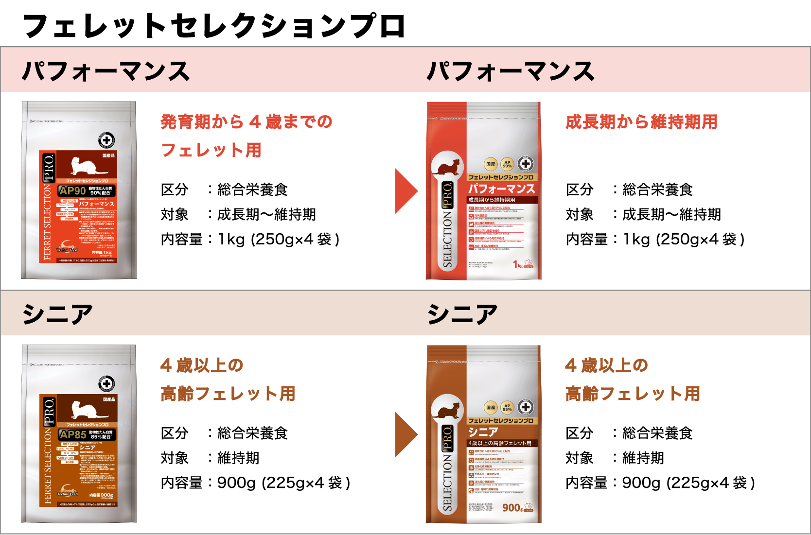 それぞれのアイテムを使用するフェレットの年齢・状態・体質を考慮した栄養バランスの調整を行っております。